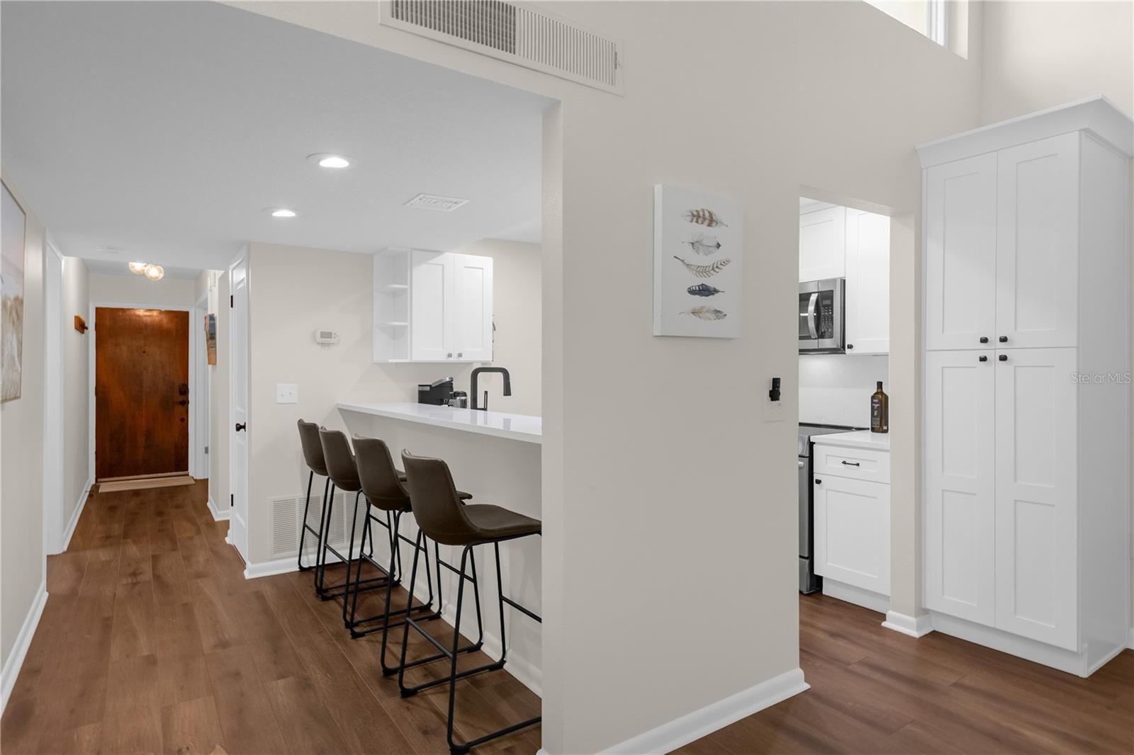 The unit features modern finishes throughout, including the removal of the popcorn ceiling, replaced with fresh knockdown texture and paint that create a clean, updated atmosphere. Recent renovations include brand-new plumbing and a hot water tank, providing peace of mind with new shut-off valves installed for the entire unit. Underfoot, luxury vinyl plank flooring adds durability and sophistication, enhanced with cork backing for superior noise control.
